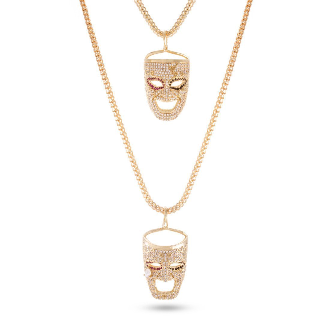 Taking its meaning from the Ancient Greek theater masks, the Laugh Now, Cry Later symbols continue as a popular idiom in pop-culture. Now, King Ice reimagines these iconic pieces into 14K Gold plated pieces. Each pendant uses AAA, handset stones to provide that classic look, while each set comes with 24” and 20” stainless steel Franco chain.