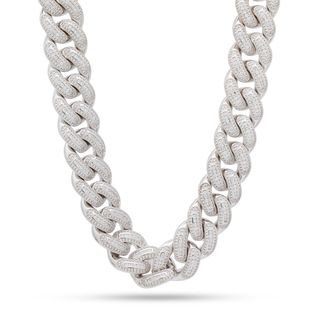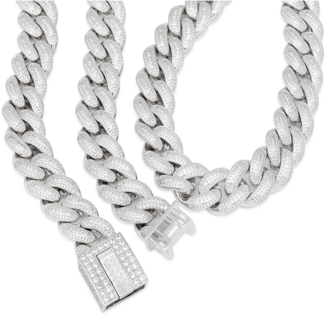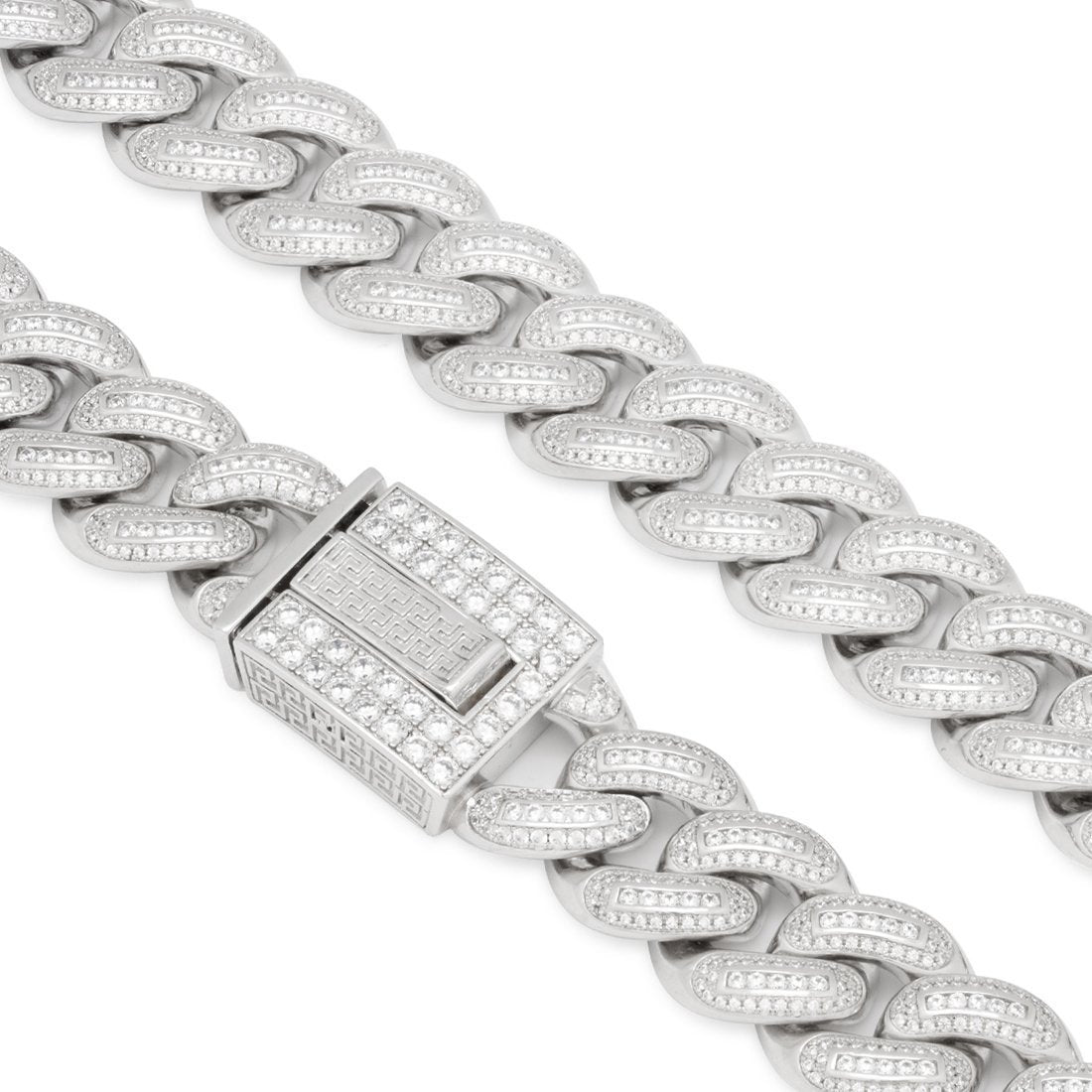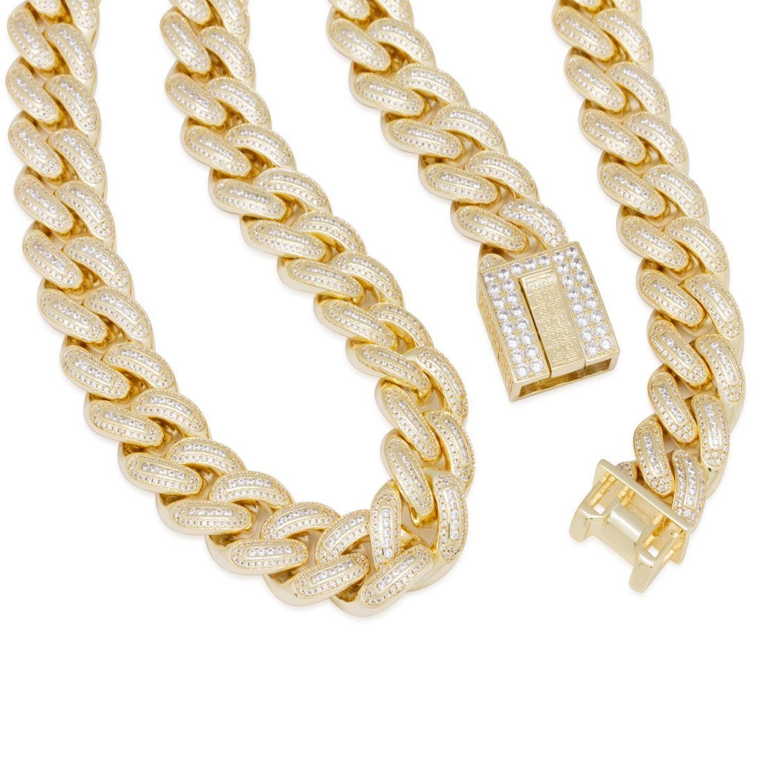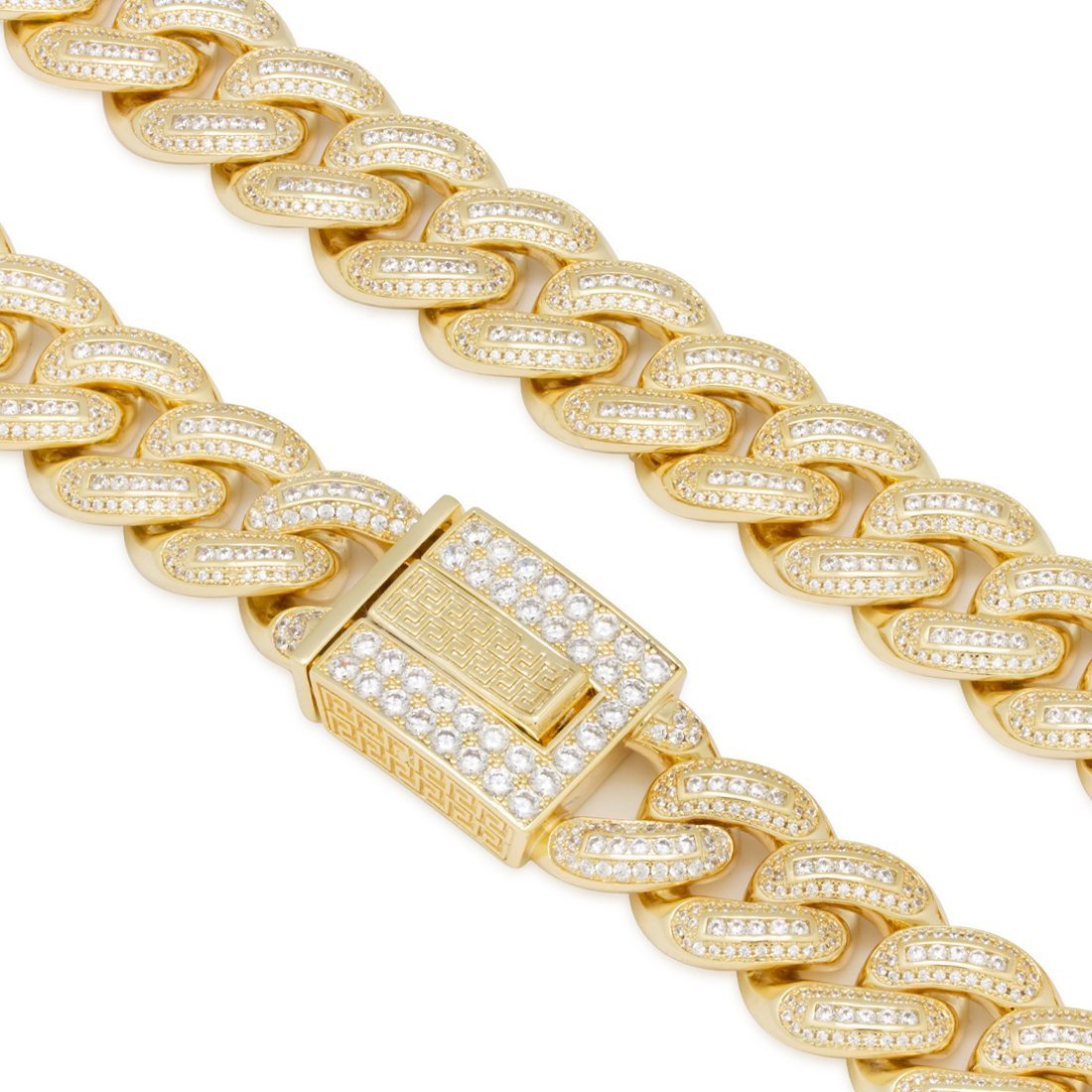 Completely iced with over 2,400 CZ stones, the new 18mm Iced Miami Cuban Chain has a heavy set look to it. In each link, there's a middle row of CZ stones bordered by more stones. Available in 14K Gold plating and white gold plating, the multi length chain matches perfectly with the bracelet. The stainless steel chain comes with a new custom Greek Key box clasp that's iced with large CZ stones for a secure and comfortable wear.