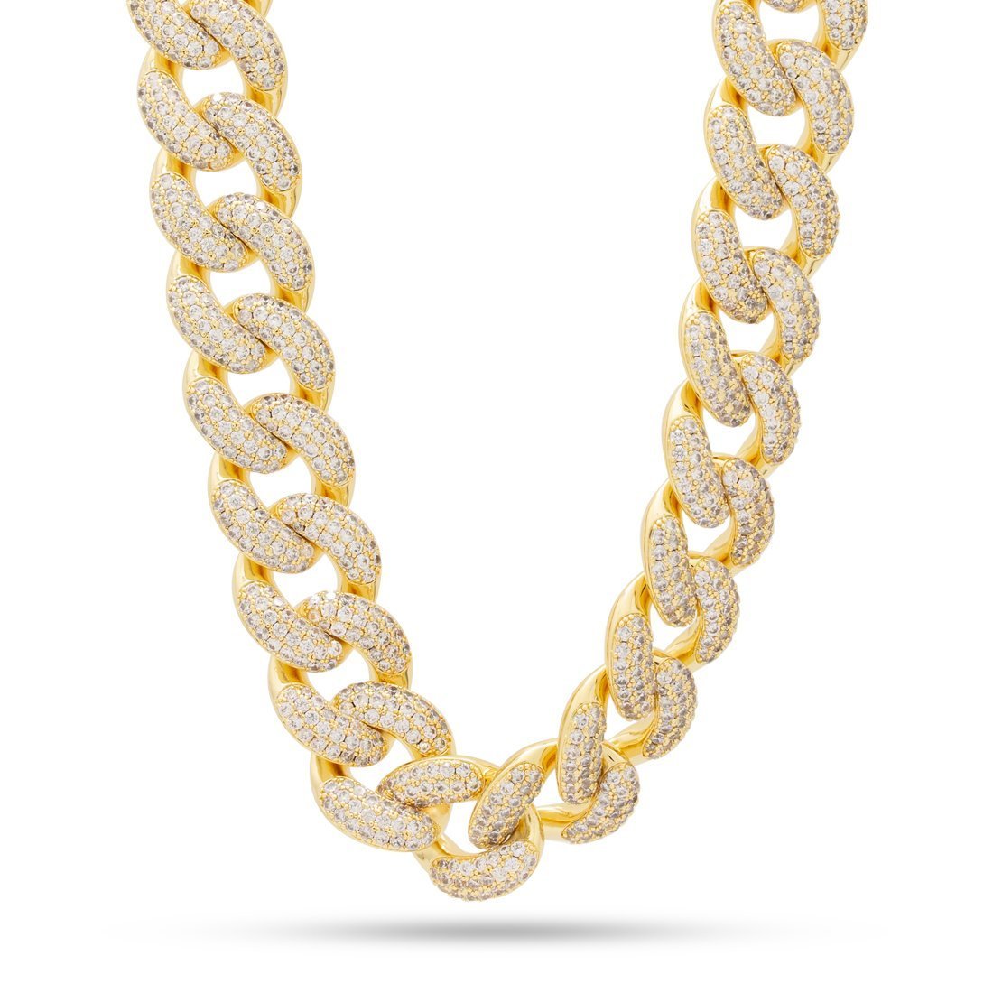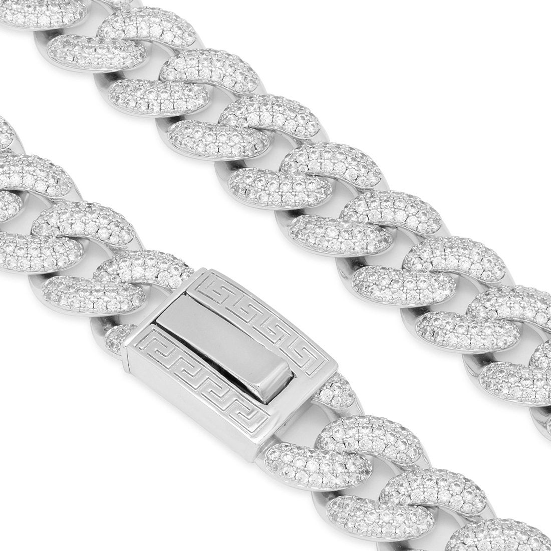 The classic King Ice Miami Cuban Chain is back. With endless CZ stones, the chain has a radiant look to it. Available in 14K Gold plating and white gold plating, the 20mm multi length chain matches perfectly with the bracelet. The chain comes with a custom Greek Key push down clasp for a secure and comfortable wear.