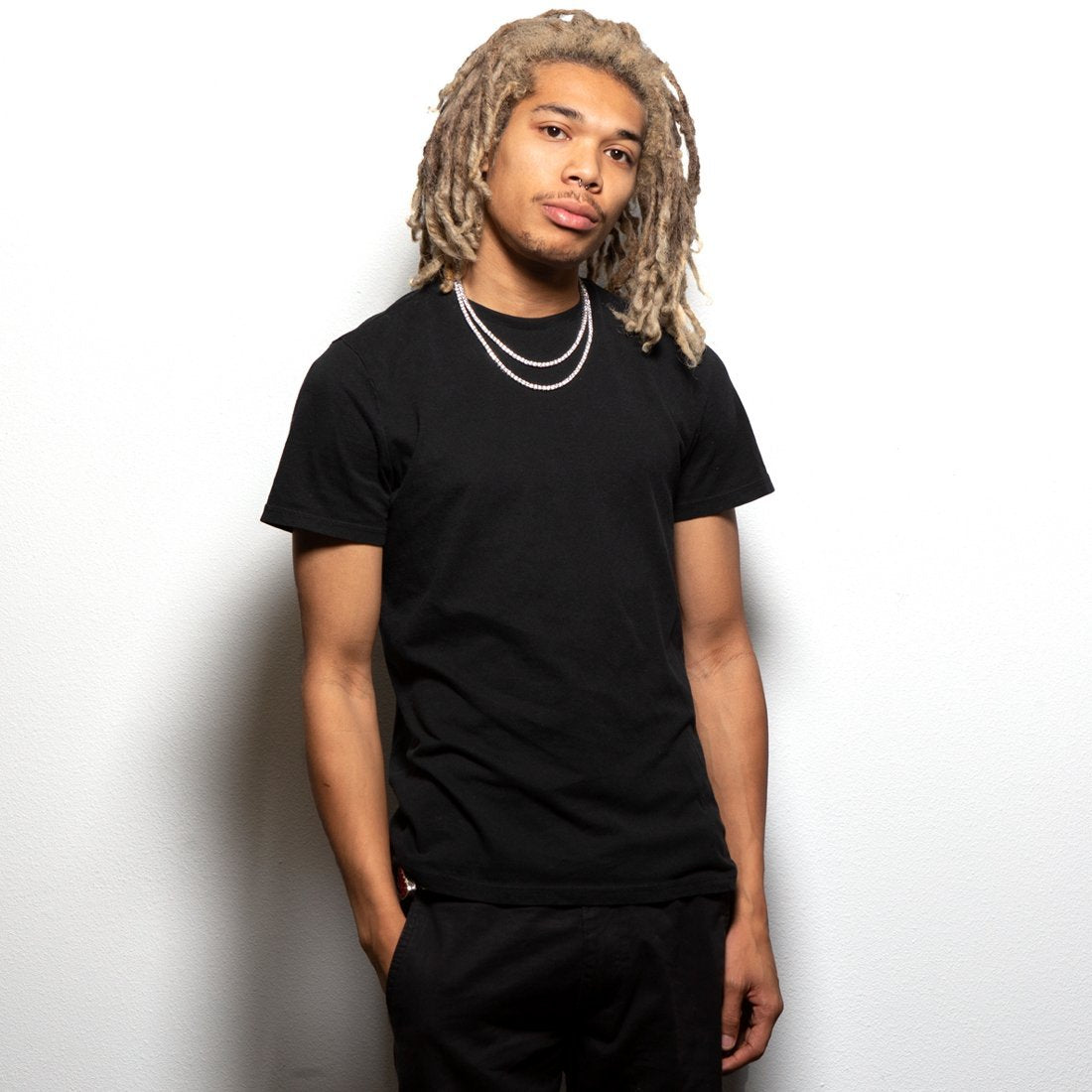 The new King Ice 4mm White Gold Tennis Choker Set pays tribute to the multi use trend rooted by prominent hip hop artists since the late 70s. Each choker is plated with a white gold finish and white gold prongs frame VVS Diamond Simulates. The chokers measure 18" and 20" for a suitable match when worn together.