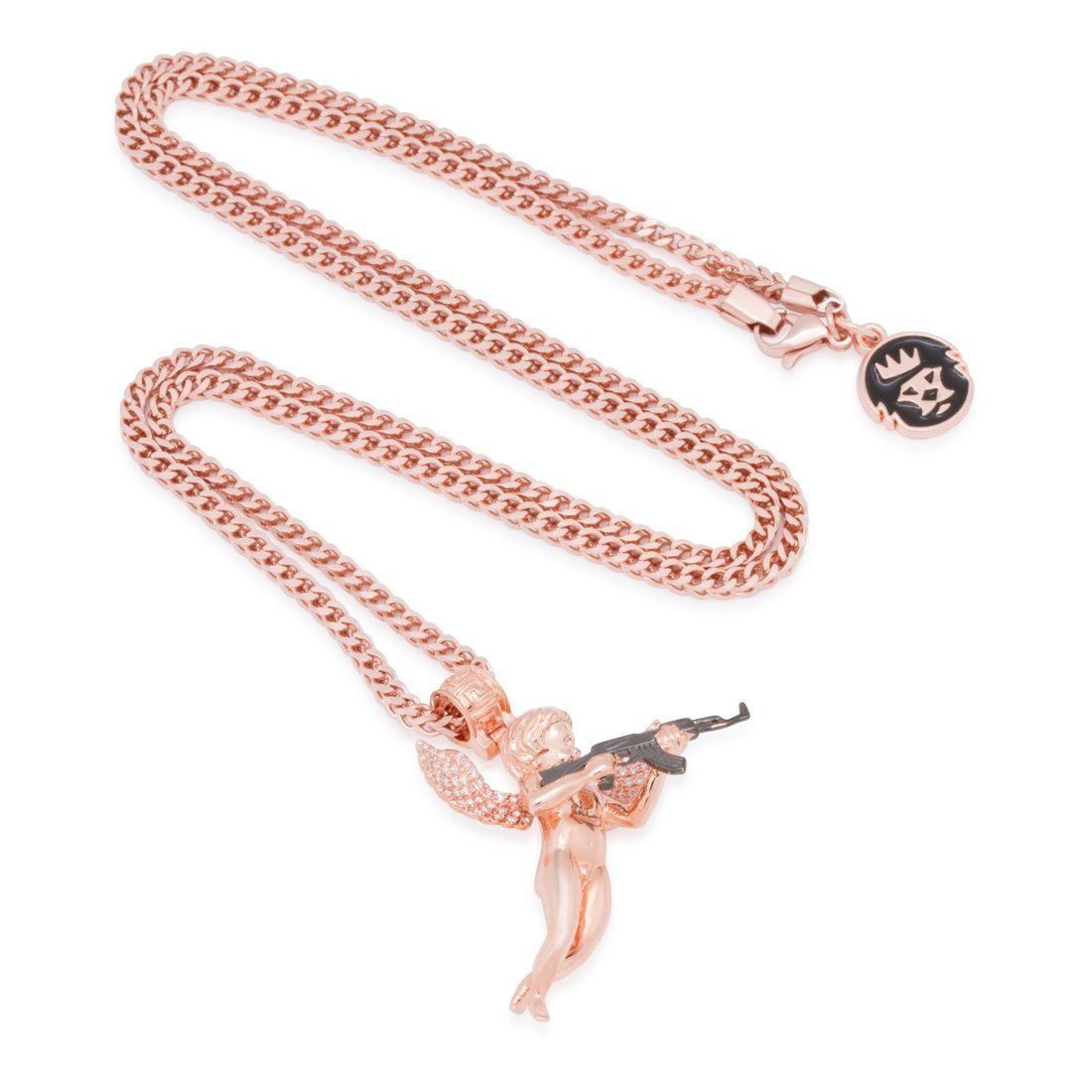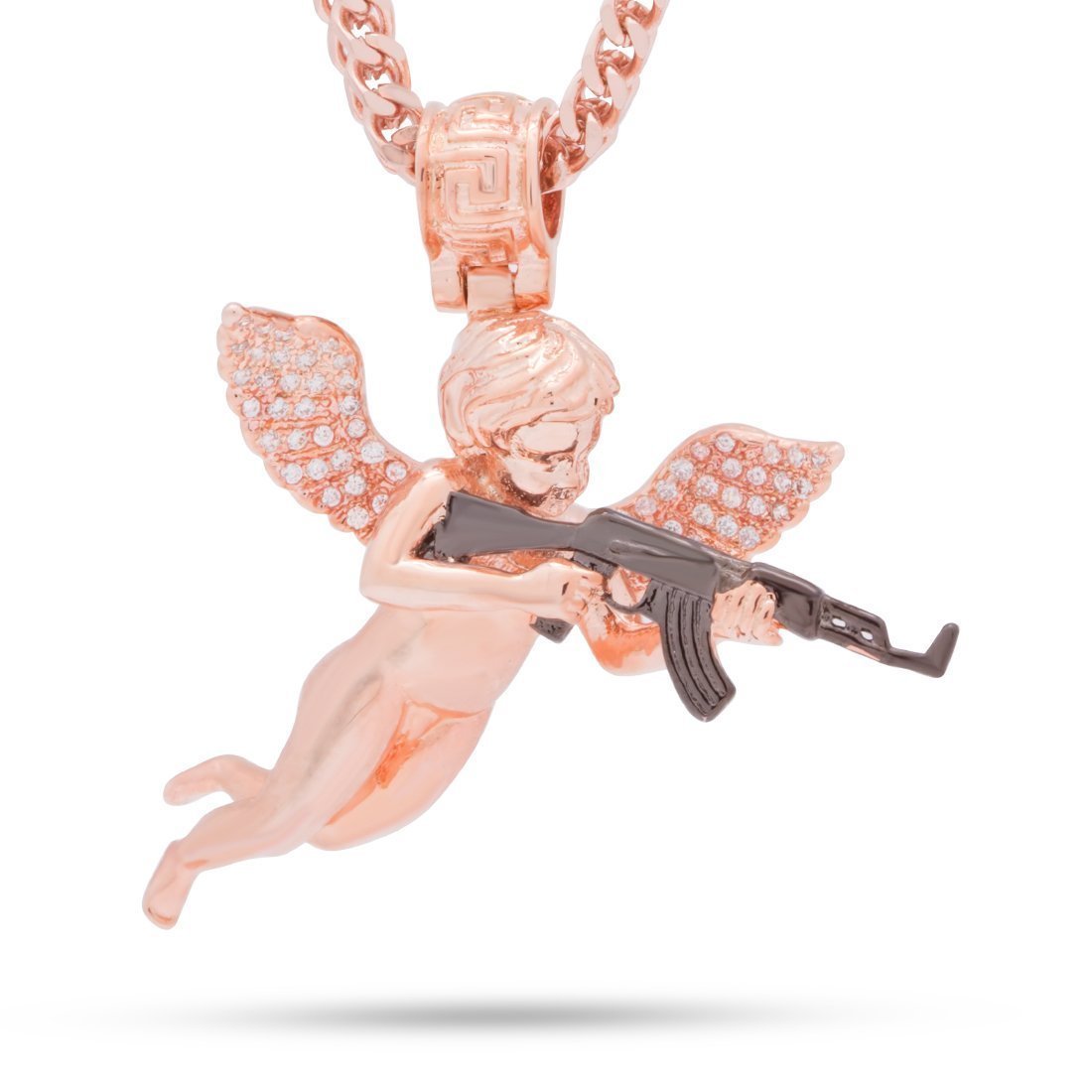 When a debt is owed, The Archangel of Reprisal ensures the debt is paid. Plated in 14K gold, each angel comes studded in clear, CZ stones along with its wings, while its black-plated AK-47 ensures its aim stays true and its punishment swift. Meanwhile, its Greek-key bale provides the perfect option for the 2.5mm, 20" Stainless Steel Franco chain included with each pendant.