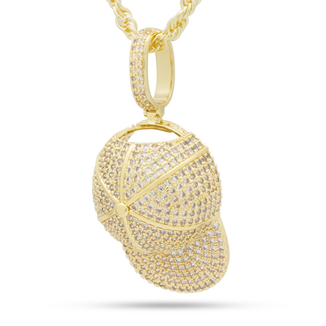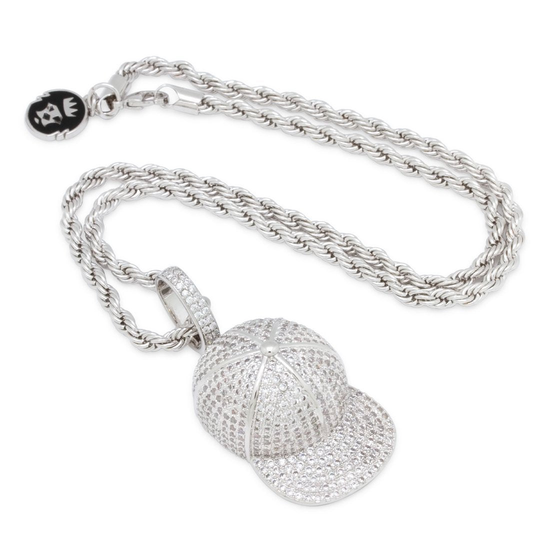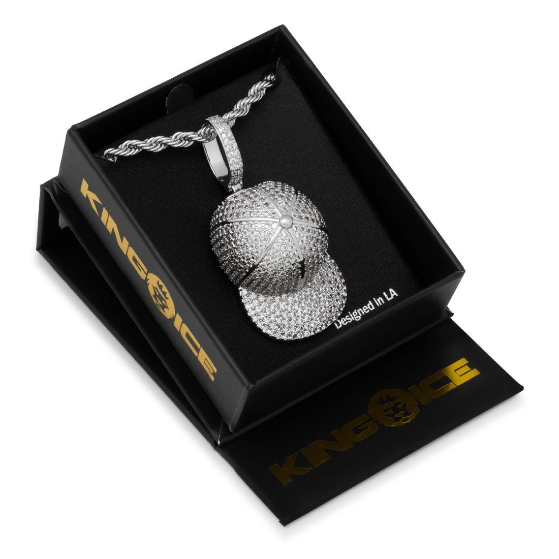 King Ice's new Baseball Hat Necklace is the definition of iced. The pendant has more than 400 VVS Diamond Simulates covering the panels and bill of the hat. The strap of the hat is detailed with its buttons. The necklace is dipped five times in 14K Gold plating and white gold plating for a flashy finish. Each pendant is paired with a 4mm, 20" Rope Chain.
