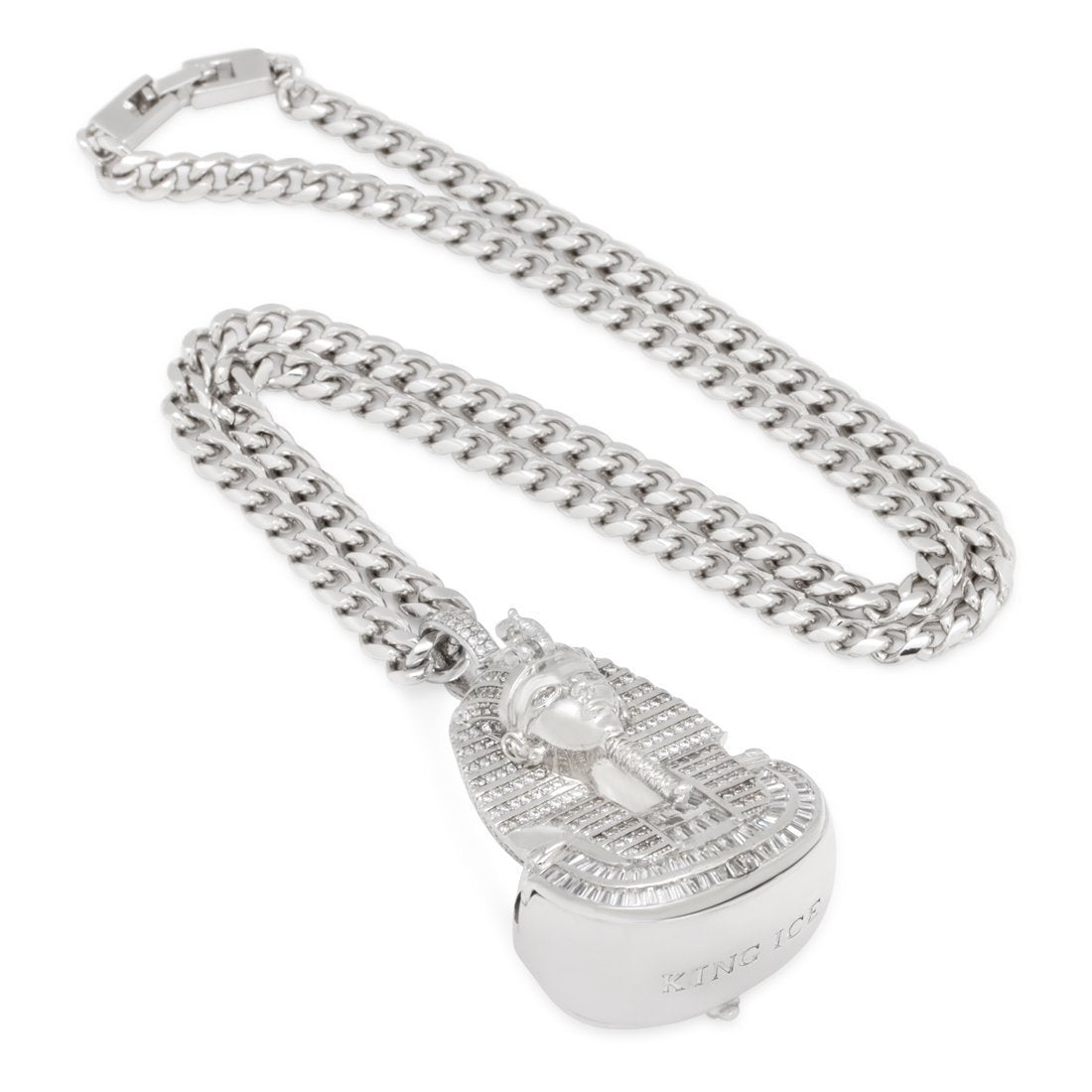 Although King Tut was a pharaoh in an Egyptian dynasty, he is widely recognized for the tomb he was buried in. Available in 14K Gold and white gold, we have replicated King Tut's tomb to include a secret stash to hide your "valuables." This new version of the pendant has more baguette cut VVS Diamond Simulates on the King's garment. Each pendant is paired with a 5mm, 20" Miami Cuban chain.