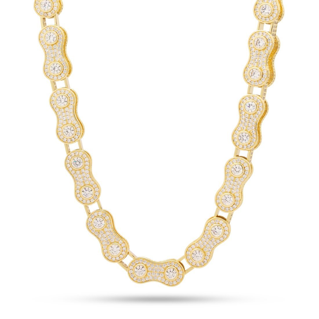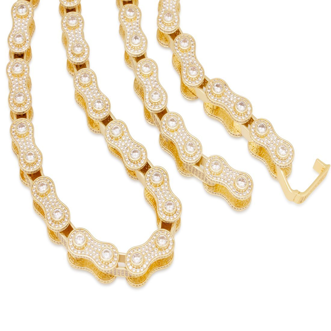 The new Iced Bike Chain has more than 3,500 clear handset CZ stones. Large CZ stones decorate the pins of the chain, while smaller stones cover the inner plates and rollers. The chain is available in 14K Gold plating and white gold plating, as well as in multiple lengths. The chain features a fold over clasp for a secure and comfortable wear. A Greek Key design is engraved on the inside of every link for the perfect finish.