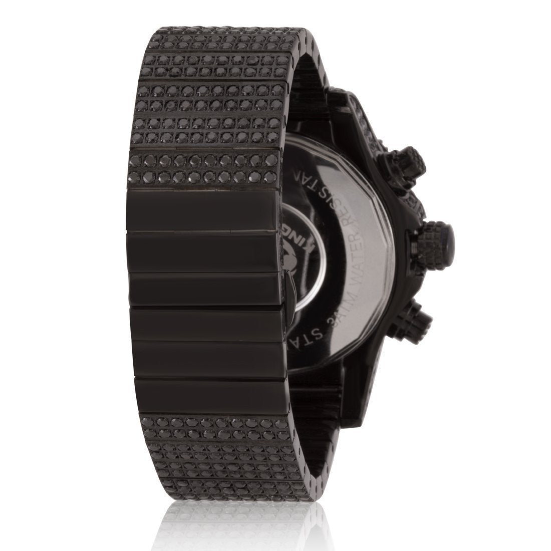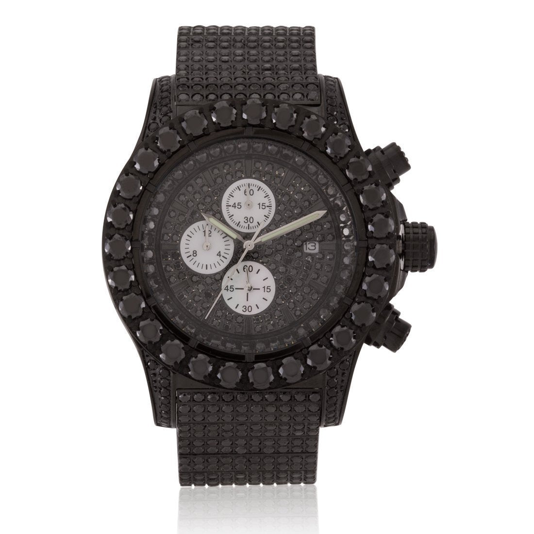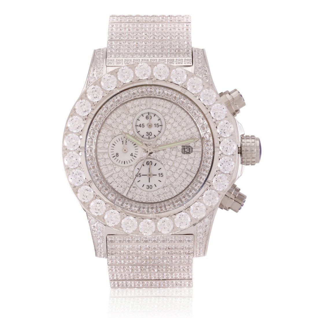 The Magistrate Watch uses handset VVS Diamond Simulate stones to create the grandiose look and feel. Featuring triple chronographs to track every second from this Japanese movement watch, and with a 1" wide band and a 2" wide face, this watch provides the big and large dial you look for in a man's watch.