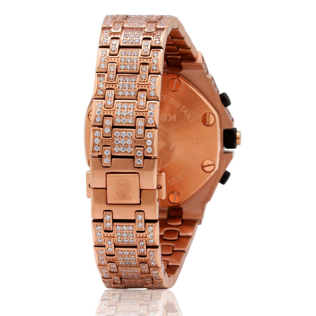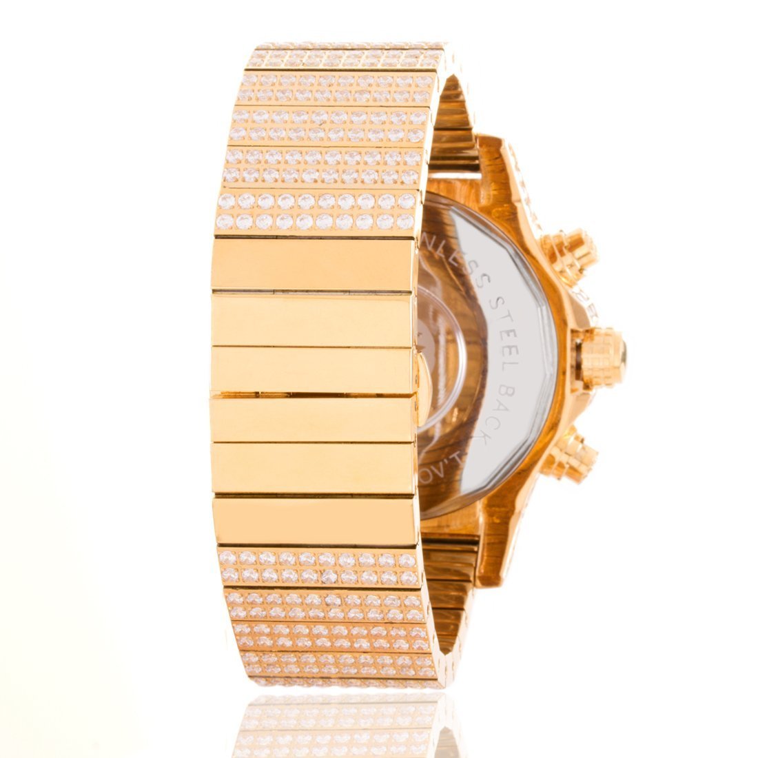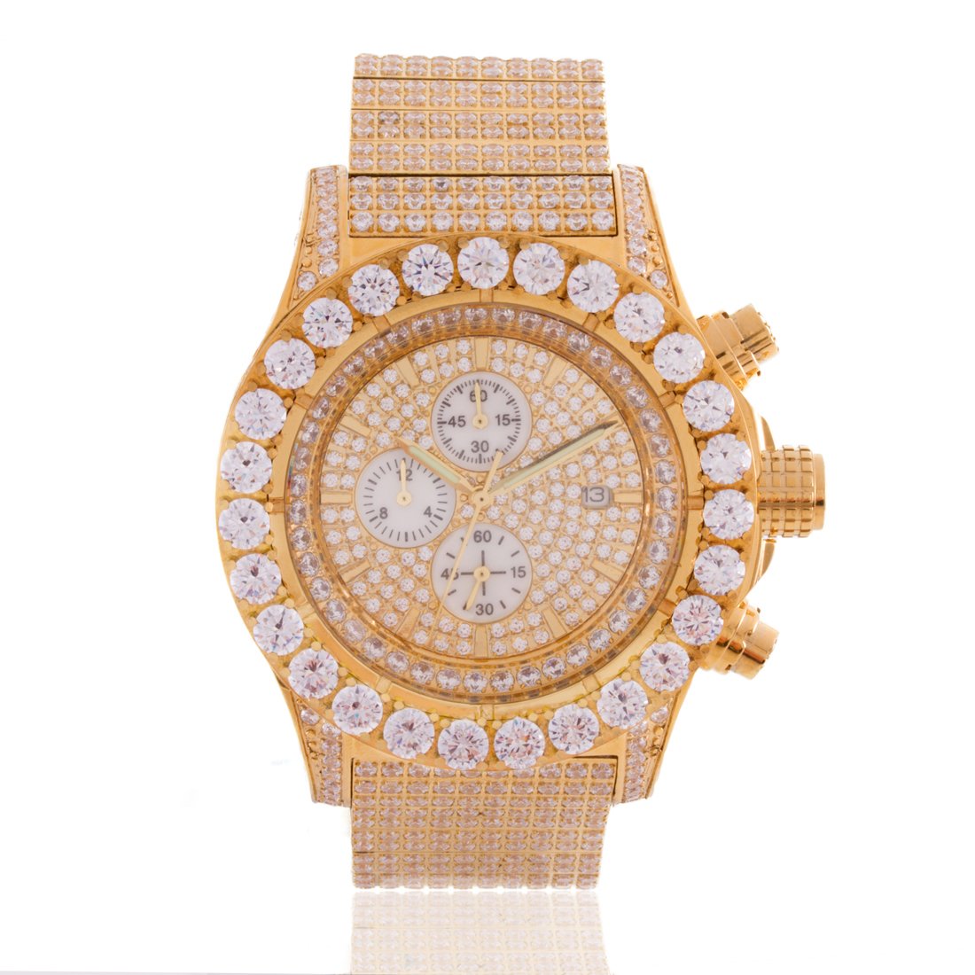 The Magistrate Watch uses handset VVS Diamond Simulate stones to create the grandiose look and feel. Featuring triple chronographs to track every second from this Japanese movement watch, and with a 1" wide band and a 2" wide face, this watch provides the big and large dial you look for in a man's watch.
