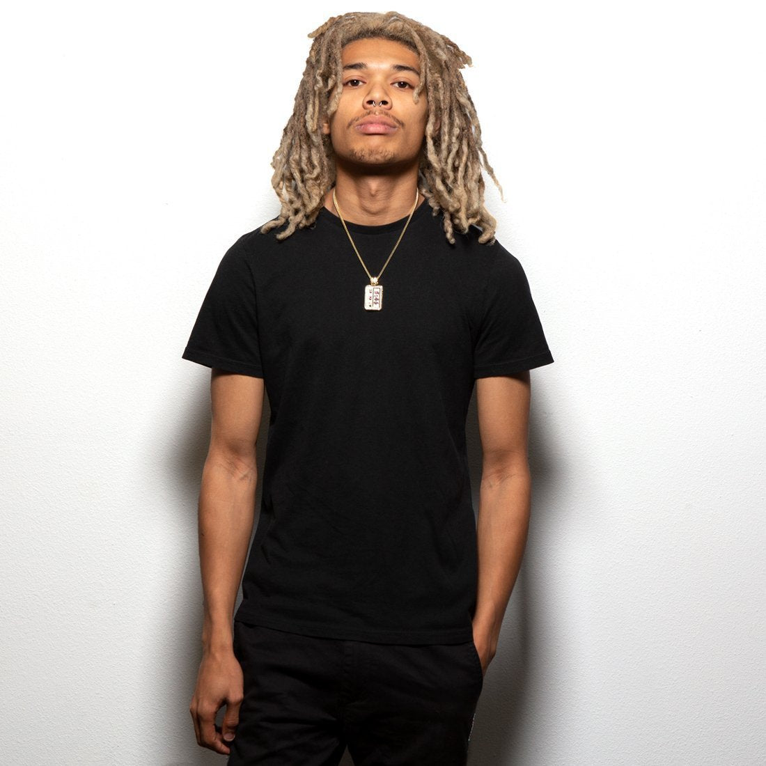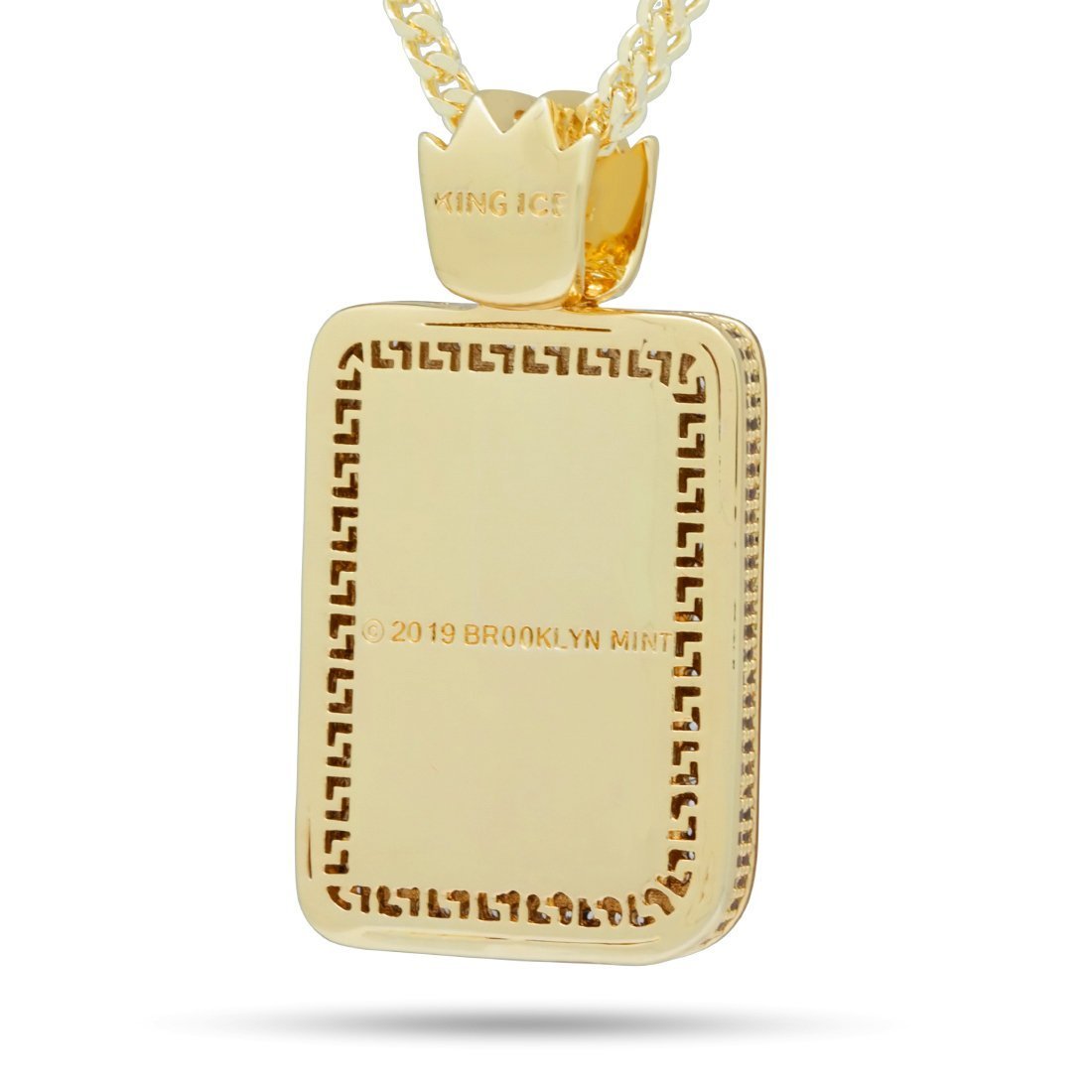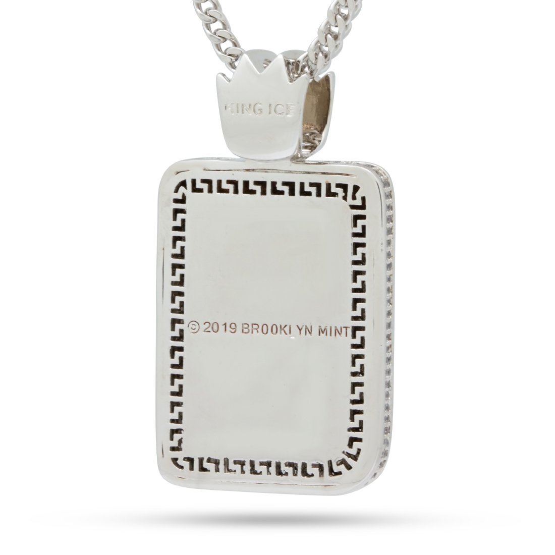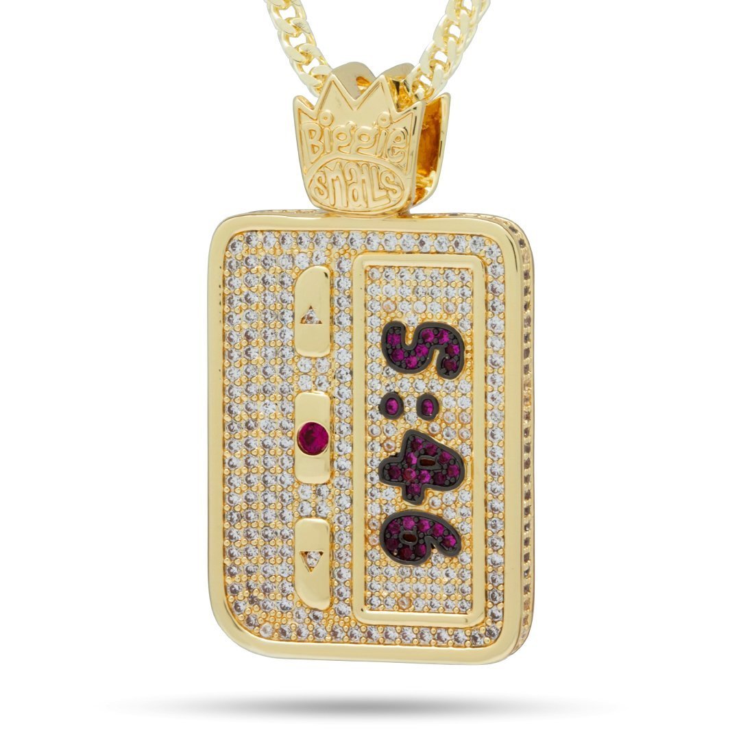 A classic Biggie pager is part of the new Notorious B.I.G. x King Ice collaboration. The time displays 5:46, from Biggie's hit song "Warning," with magenta CZ stones. The rest of the pager is iced with clear CZ stones. Each necklace comes with a 2.5mm, 20" Franco Chain and is available in 14K Gold plating and white gold plating.