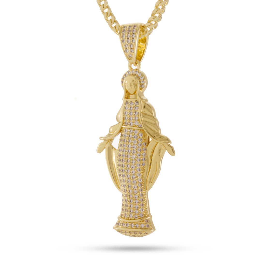 Depicting the love and saving grace of Jesus, the Lady of Grace Virgin Mary aims to provide a vivid representation of the most iconic pose of Mother Mary. Each pendant features AAA, handset stones and includes a 2.5mm, 20” Franco chain.