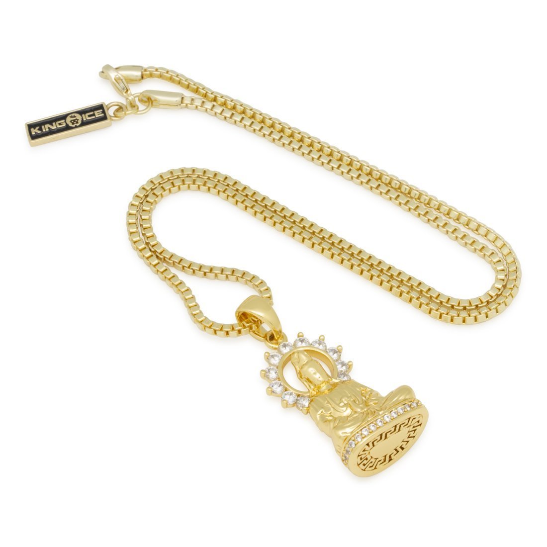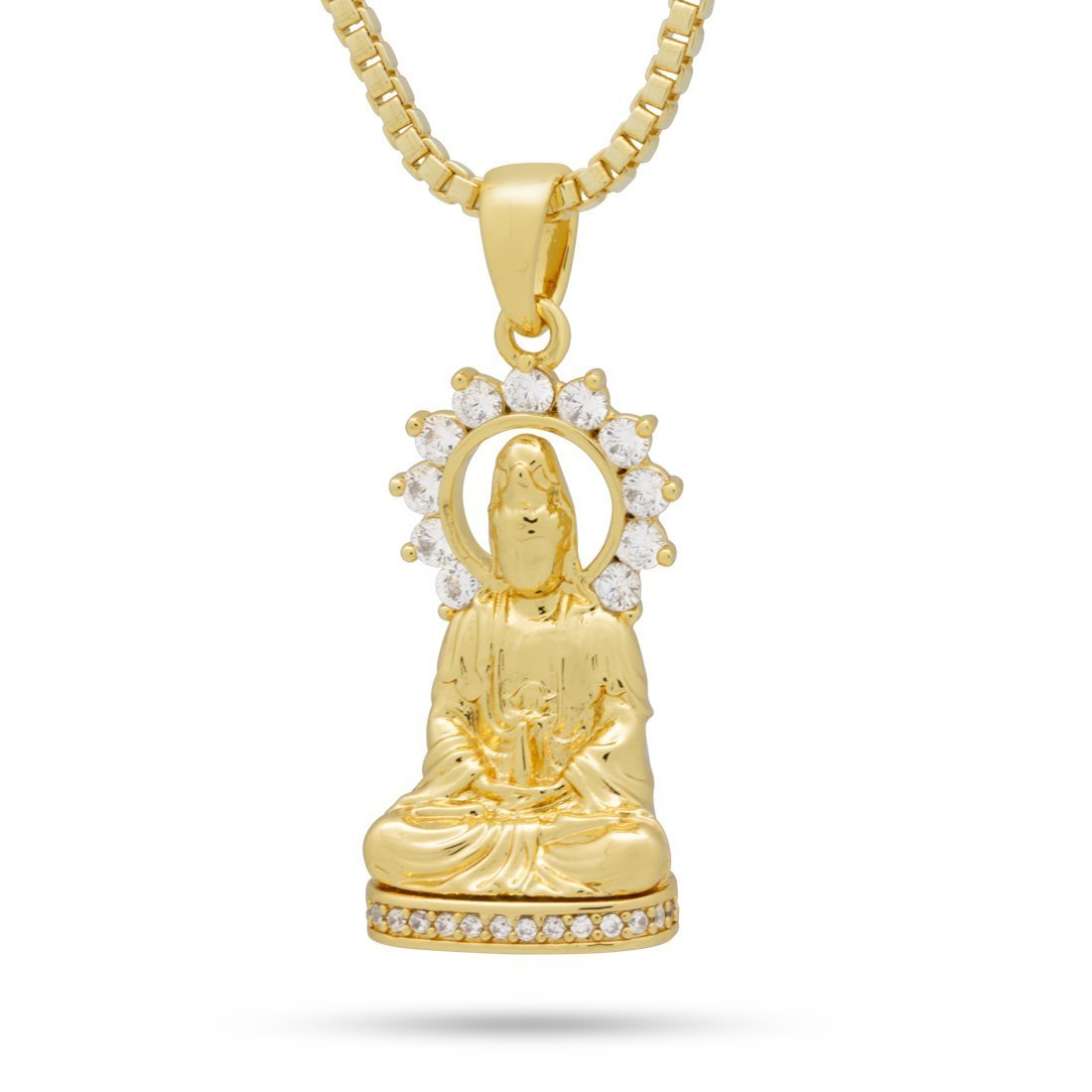 In Hinduism, Shiva is supreme being that created and transformed the universe. With close attention to detail, each Shiva Necklace is crafted to best replicate the God of Destruction. using 14K gold plating and high quality CZ stones. A 18" 2mm stainless steel Box chain is paired with each necklace.
